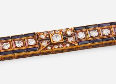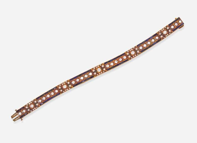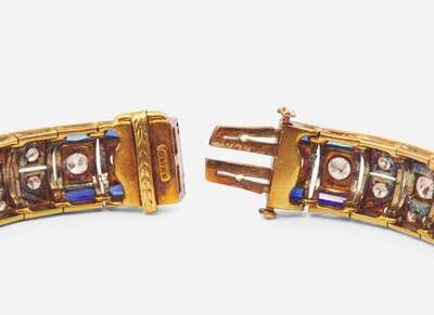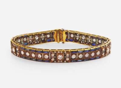 A highly flexible ladies platinum and 14K yellow gold bracelet with textured rectangular fancy links, set with faceted rectangular-cut sapphires, and round brilliant-cut and single-cut diamonds. Diamonds are near colorless (G – J), with SI – I clarity. Total estimated weight of diamonds: 3.35 carats.