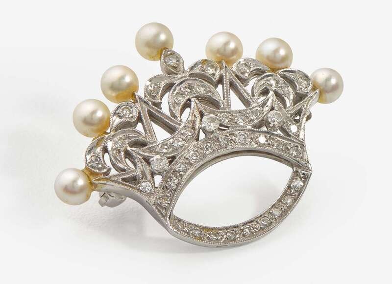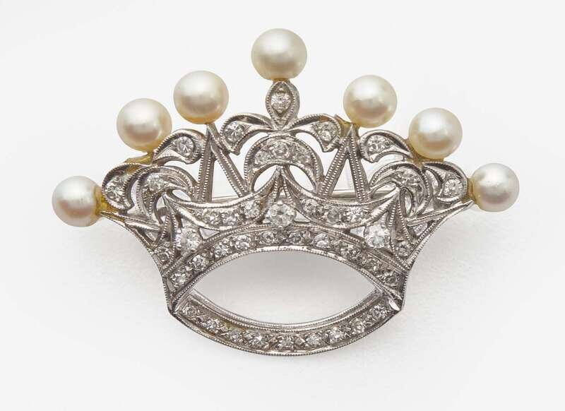 A 14K white gold brooch designed as a crown, set throughout with single-cut and round brilliant-cut diamonds, and accented by a row of round white pearls along the top. Diamonds are near colorless (G – J), with SI – I clarity. Total estimated weight of diamonds: 0.50 carats.
