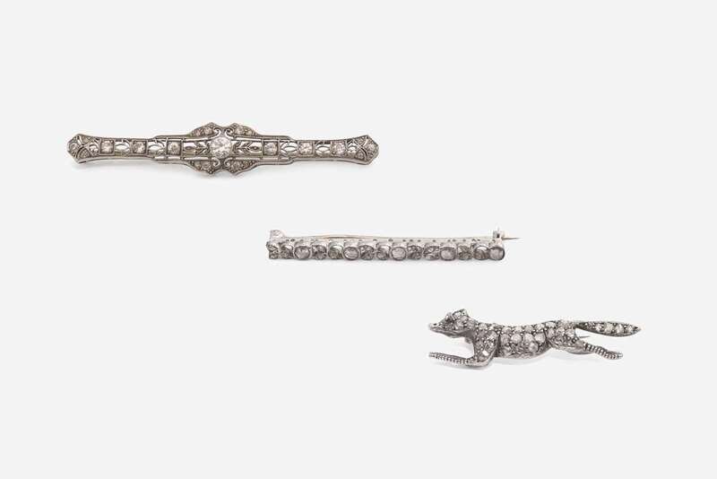 A group of three pins, including a 14K white gold bar pin set with rose-cut diamonds, a 14K white gold Art Deco-style filigree bar pin set with round brilliant-cut and single-cut diamonds, an a 14K white gold fox pin set with round cabochon ruby eyes and rose-cut diamond throughout the body. Diamonds are near colorless to faint color (H – L), with SI – I clarity. Total estimated weight of diamonds: 2.07 carats.