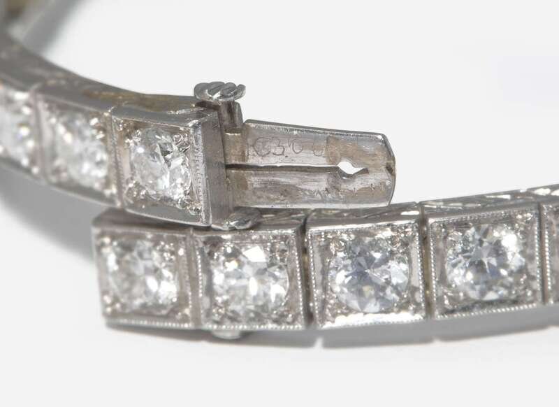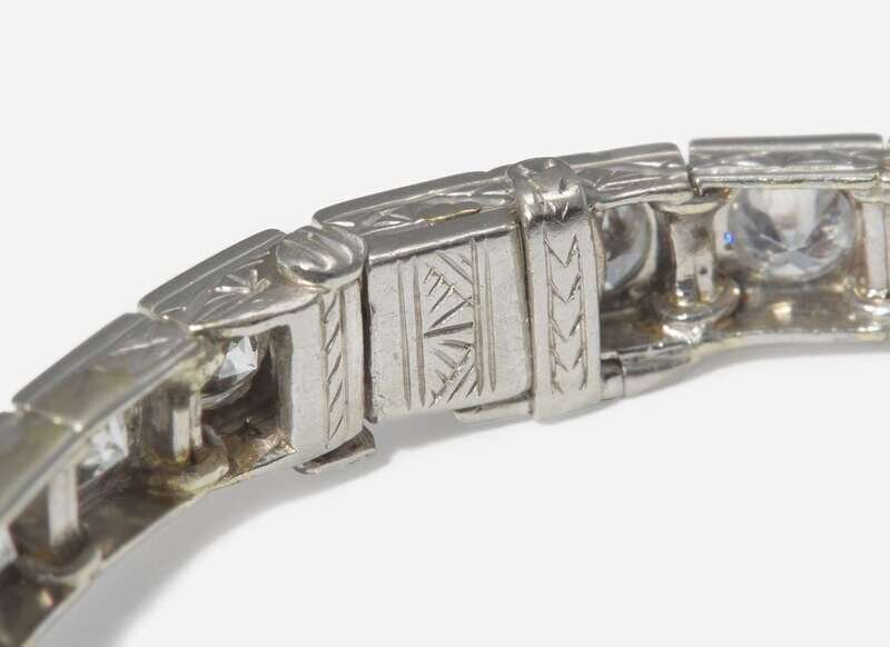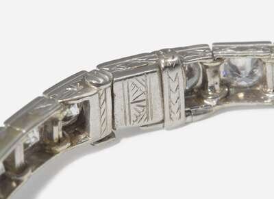 Overall Condition: Some scratches and signs of wear, signs of repair evident, likely converted from a flexible line bracelet to a hinged bangle. Metal not stamped, testing as platinum, box clasp and safety latch in working order.