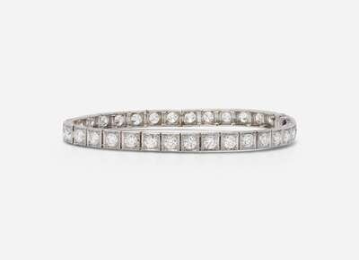 An Art Deco hinged bangle bracelet with square platinum link each set with an old European-cut diamond. Diamonds are near colorless (G - J), with VS - SI clarity. Total estimated weight of diamonds: 5.75 carats.