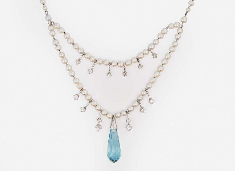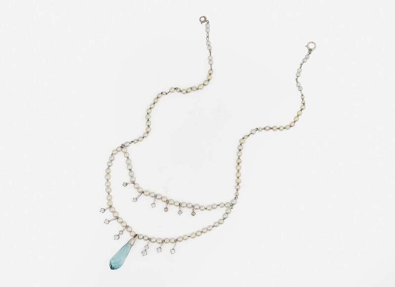 A 14K white gold necklace set throughout with near-round white and silvery pearls, featuring a swag with round brilliant-cut diamond accents and a carved aquamarine briolette. Diamonds are near colorless to faint color (H – L), with SI – I clarity. Total estimated weight of diamonds: 1.60 carats.