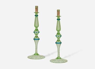 A large pair of Venetian or Murano green and blue blown glass candlesticks, 20th century