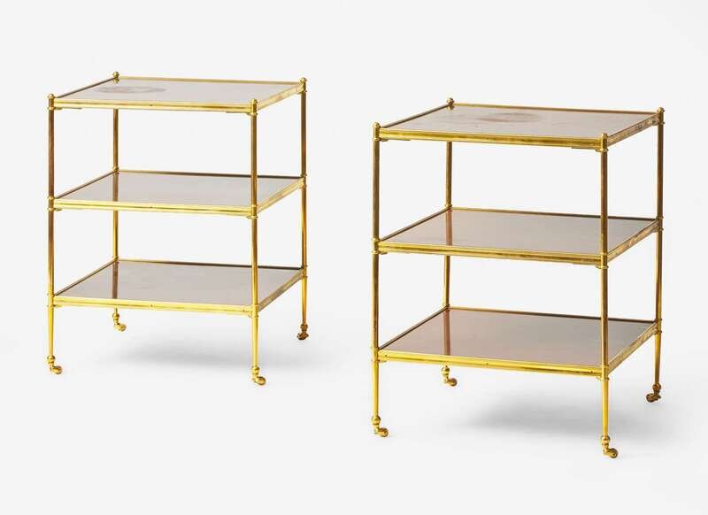 A pair of French gilt bronze and mahogany three-tiered side tables, in the manner of Maison Jansen, 20th century
