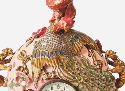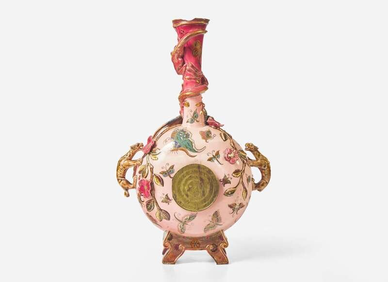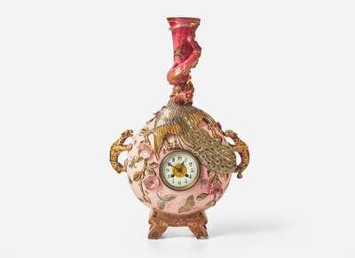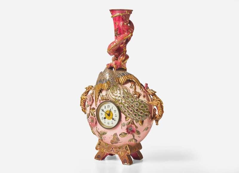 Of disc form with flared rim, the neck with applied twisting dragon attacking a perched peacock, with flowering branches beneath, the body and neck painted with butterflies and insects, with two applied handles in the form of arched felines, on scrolled bracket base allover decorated with spirals and floral motifs, with enamel dial faintly inscribed, “J.E. Caldwell & Co./ Philadelphia,” the underside marked with five churches mark, “Zsolnay Pecs/ TJM,” and impressed numerals, “1110/ 13," the clock works marked, “Japy Frères & Cie/ Gde Med. D'Honneur.”