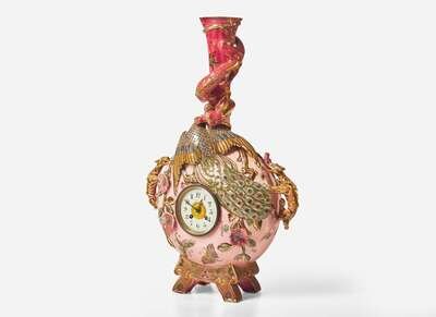 An Aesthetic Movement Zsolnay lustreware clock vase, Pecs, Hungary, with works by Japy Frères & Cie, Paris, retailed by J.E. Caldwell & Co., Philadelphia, PA, 1878-1879