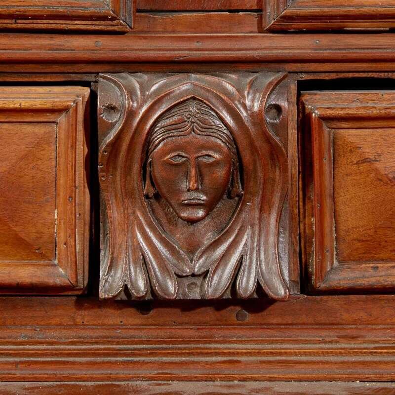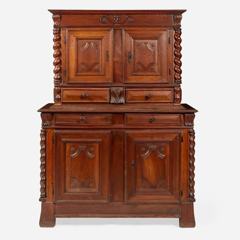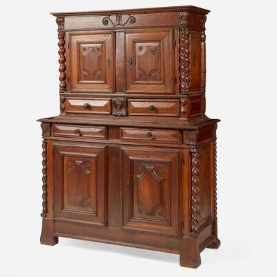 In two parts, the upper section with molded cornice over plain frieze with carved floral motif and acanthus carved corners, two paneled doors with carved rosettes, revealing shelf and flanked by barley twist columnettes, over two drawers flanking carved face and flanked by carved heart and diamond motifs, the lower section with conforming details including acanthus carved corners, barley twist columnettes, drawers, and paneled doors, on flared block feet.