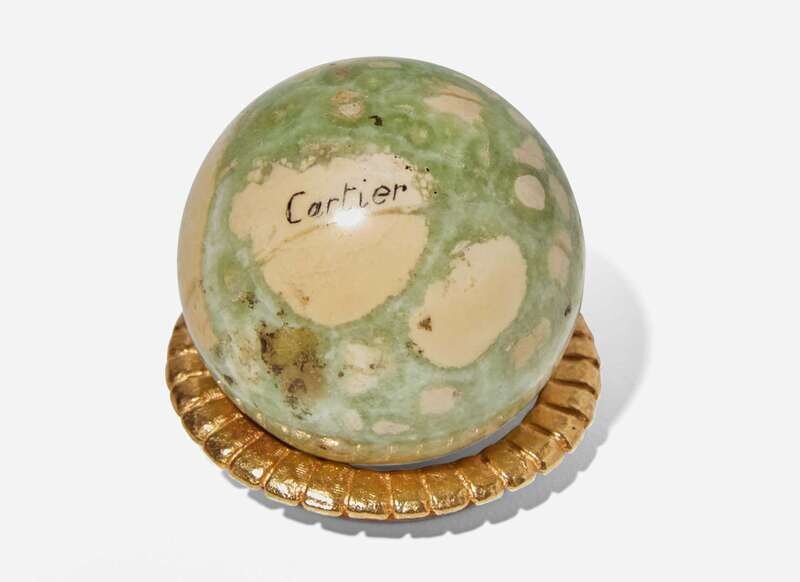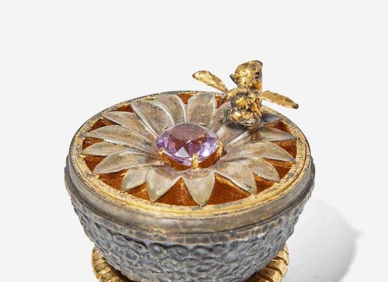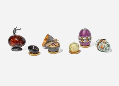 Comprising an Elizabeth II gilt-washed sterling silver surprise egg, Stuart Devlin, London, 1967, the interior revealing daisy with faceted amethyst to center, with gilt bee on spring above, marked to underside; a silver gilt, cloisonné, and guilloché enamel egg, bearing Russian ФР marks and 88 zolotniki mark; a sterling silver-mounted glass egg, surmounted by trumpeting elf, by James Schwabe (1918-2008) for Patrice, New York, NY, marked “Patrice/ Ster” and signed “J. Schwabe” to underside; a Portoro marble egg and a Breccia marble sphere, by Cartier (French, founded 1847), Paris, both marked “Cartier”; and an enamel-decorated egg with squirrels and nesting birds among tree branches, inscribed, “Easter 1975,” by Halcyon Days, Bilston and Battersea Enamels, England, marked to interior; accompanied by four gilt metal egg rings.