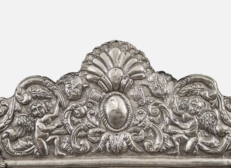 Allover decorated by repoussé foliate motifs, the cornice with oval reserve flanked by two angels.