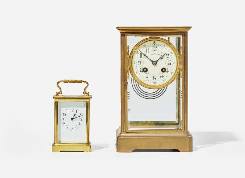 The larger clock by Samuel Marti & Cie, with enamel dial inscribed “Tiffany & Co.," the works marked, “S. Marti et Cie/ Medaille D'Argent 1880,” “Made in France,” “411” and “3749”; the smaller clock with handle, plain enamel face, the works marked, “H&H" and “Made in France.”