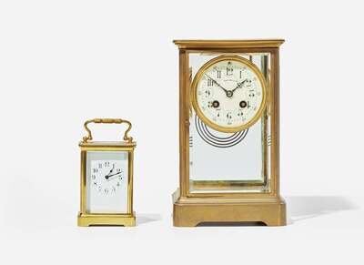 Two French gilt bronze carriage clocks, one by Samuel Marti & Cie, retailed by Tiffany & Co., New York, NY, the other imported by Harris & Harrington (1896-1919), New York, circa 1900