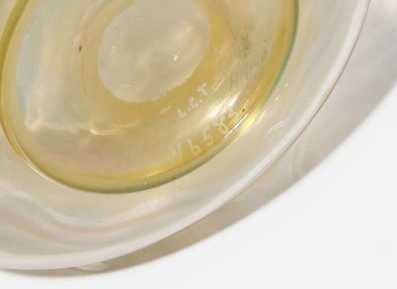 Comprising a Favrile glass decanter with stopper, by Tiffany Studios, etch-signed to underside, “L.C.T/ N6583"; and an iridescent glass trumpet vase, by Quezal, etch signed to base, “Quezal,” with gilt bronze scrolled base with putto.