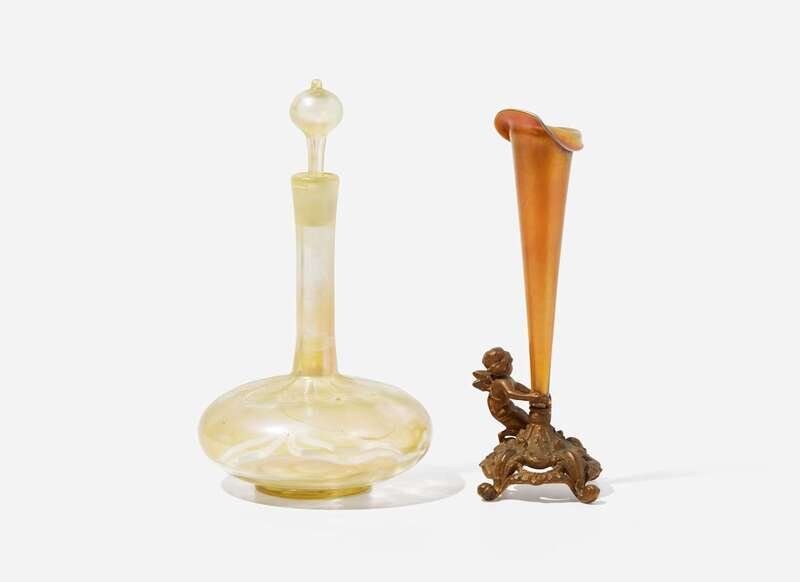 Tiffany Studios (American, active 1878-1932) and Quezal Art Glass and Decorating Co. (American, c. 1901-1924), A Favrile Glass Decanter and An Iridescent Glass Trumpet Vase on Gilt Bronze Base, New York, NY, early 20th century