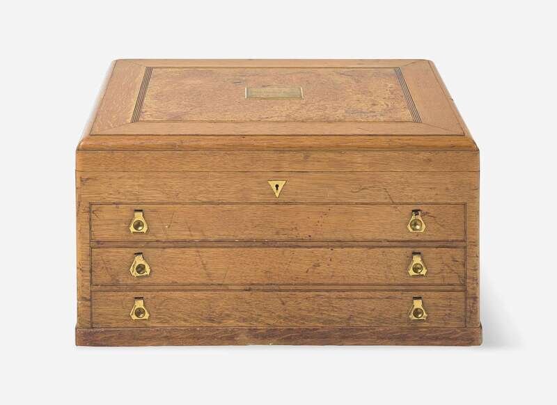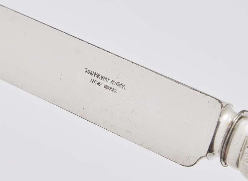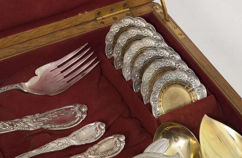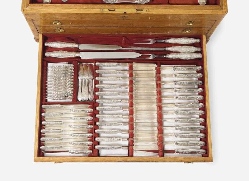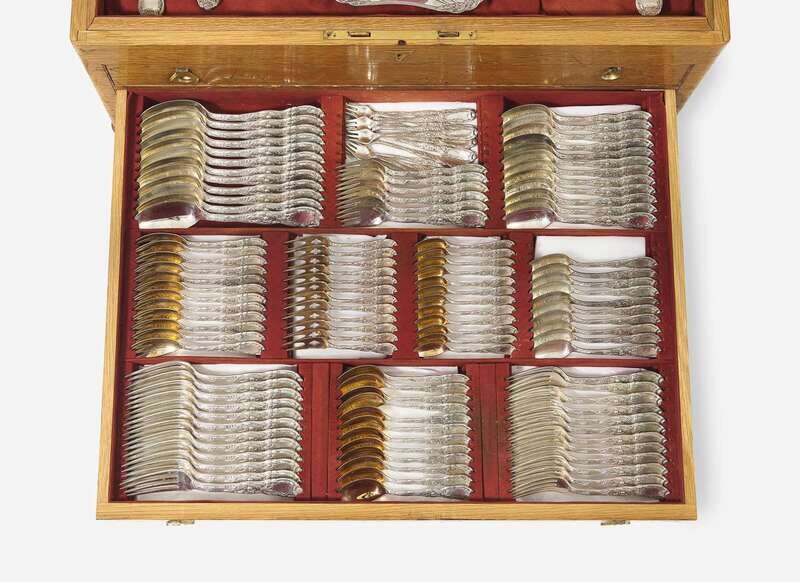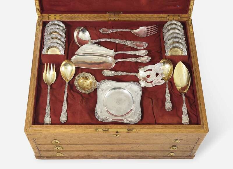 Housed in the original oak storage box, with inset pollard panel to top, with brass plaque engraved, “Lille Seeley Coler," the interior with brass plaque engraved, ”Tiffany & Co./ Silversmiths," with brass handles and pulls, with lift-lid top and three drawers, each revealing custom fitted compartments; including many pieces with gilt-washed bowls, all items marked, including “M” mark for Edward C. Moore (1873-1891); comprising a punch ladle, a jelly knife, a salad serving fork and spoon, two fish serving knives, a fish serving fork, an asparagus fork, a serving spoon, twelve butter pats, a tea strainer, a square footed dish, twelve pepper shakers, twelve salt cellars, a pie server, a berry spoon, a cake knife, a large master butter knife, a small master butter knife, a cheese knife, three cream ladles, a jelly spoon, two salt spoons, a preserve spoon, a mustard spoon, a pea server, a toast server, a sugar tongs, twelve large tablespoons, twelve smaller tablespoons, ten teaspoons, twelve coffee spoons, twelve ice cream spoons, twelve ice cream forks, twelve dinner forks, twelve luncheon forks, six fish forks, twelve oyster forks, twelve place forks, two carving forks, two carving knives, a carving stake, twelve dinner knives, twelve luncheon knives, twelve dessert knives, twelve butter spread knives, and twelve lobster picks; together with a grape scissors in a different pattern. (240 items total).