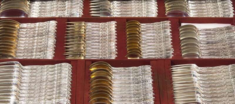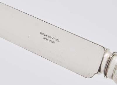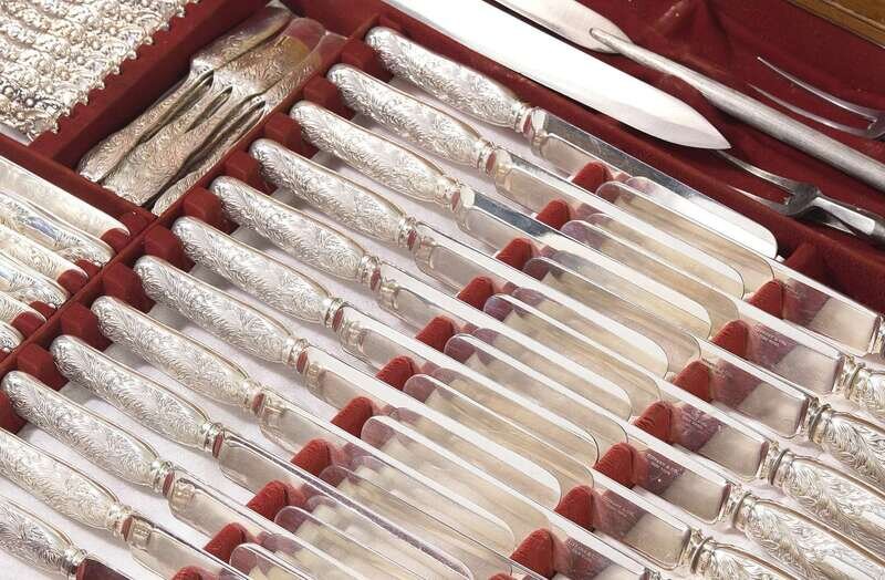 L: 14 ½ in. (carving knife), H: 14 in. W: 26 ¾ in. D: 21 ½ in. (box), Total weight: 441.77 oz. t. (weighable sterling silver, including dessert knives and master butter knives)