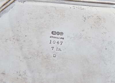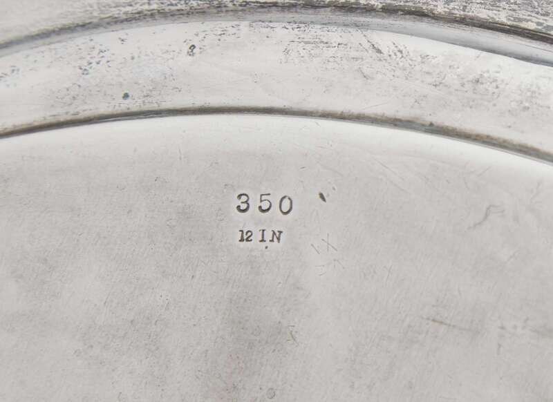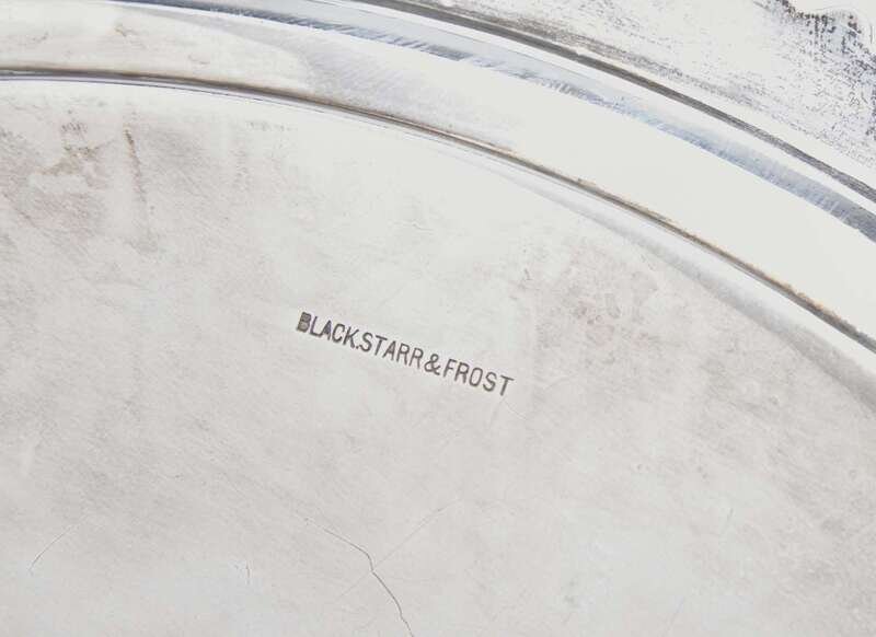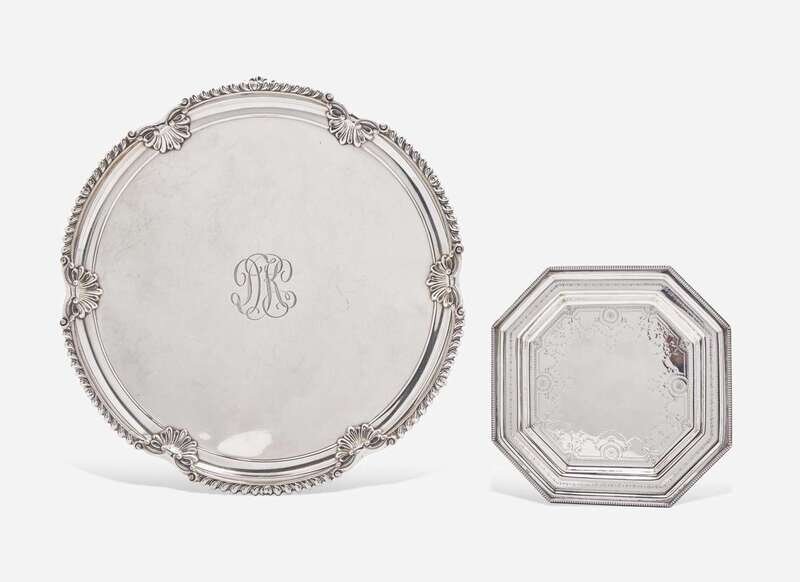 Comprising a small octagonal tray by Gorham Mfg. Co., with beaded rim and engraved decoration, marked to underside; and a footed salver by Black, Starr & Frost, with gadrooned rim having cast shell motifs, engraved with monogram, “DK,” marked to underside.