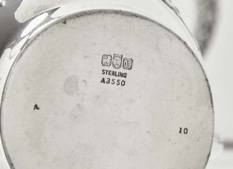 Comprising a coffeepot, a teapot, a creamer, a covered sugar dish, and a waste bowl, all engraved with monogram, “R,” marked to undersides.