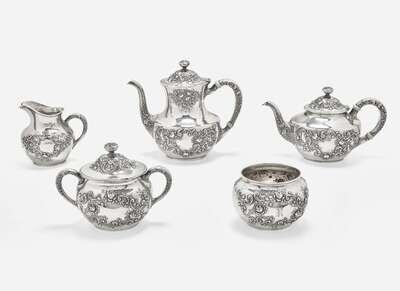 A five-piece sterling silver floral repoussé tea and coffee service, Gorham Mfg. Co., Providence, RI, bearing date mark for 1883