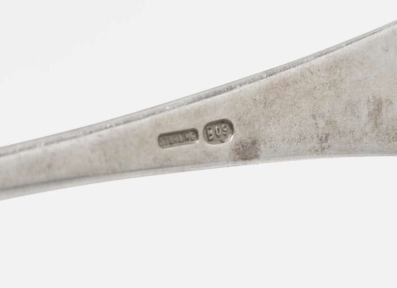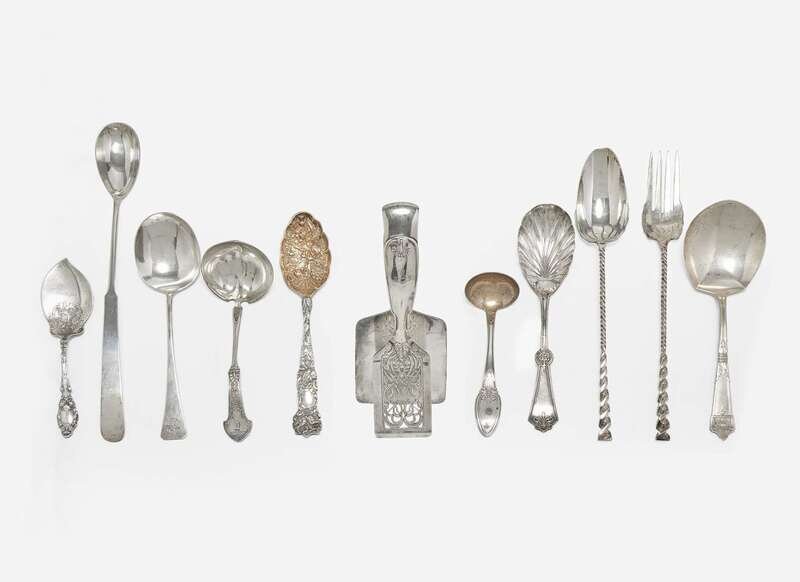 Comprising a sterling silver asparagus tongs, by Tiffany & Co., New York, NY, 1892-1902, engraved with armorial crest in the form of a hawk, the banner inscribed, “Solus Veram Perstat,” marked, including “T” for Charles L. Tiffany (1892-1902); a small sterling silver ladle with gilt-washed bowl, marked, “Sterling/ Pat. Feb. 23. 1869"; three various serving pieces by Gorham Mfg. Co., Providence, RI, including a ladle, engraved with monogram, “T,” marked “Sterling / Patent 1871,” a server, engraved with monogram, “C,” marked, “Sterling/ Pat 1904,” and a spoon marked, “Sterling/ Pat 1917”; a sterling silver salad fork and spoon, by Whiting Mfg. Co., North Attleboro, MA, marked; a sterling silver cocktail spoon, by Erickson, Gardner, MA, marked; a serving spoon, engraved with monogram, “ES,” marked, “Sterling”; and a berry spoon with gilt-washed bowl, marked “Sterling”; together with a serving spoon, by Rogers & Bro., Waterbury, CT, probably silverplated, marked.