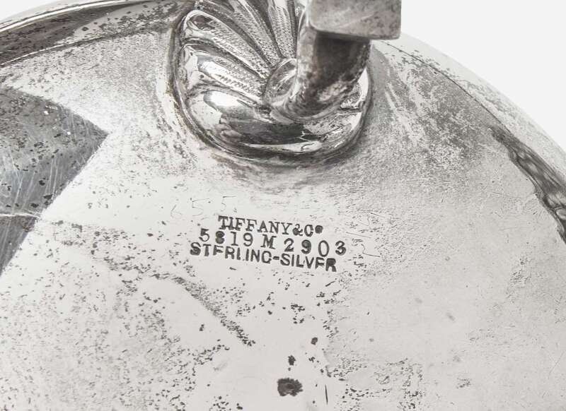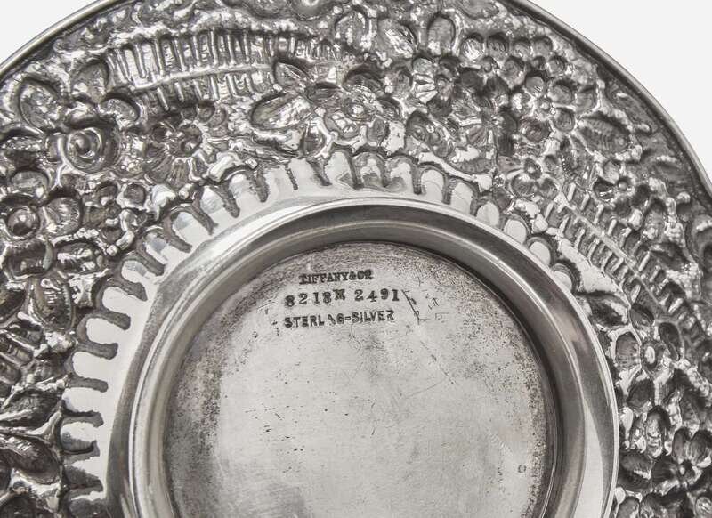 Comprising a square footed salver, bearing crest in the form of a man holding crook and scale; a round tray, bearing monogram, “R”; a bowl and stand with scalloped rims; a small dish engraved with monogram, “ELS"; a footed olive dish; a sugar dish, bearing engraved monogram, “E.G.B.” to underside; and a shoe horn; all marked, most with “M” mark for Edward C. Moore (1873-1891) and one item with “T” mark for Charles L. Tiffany (1892-1902).