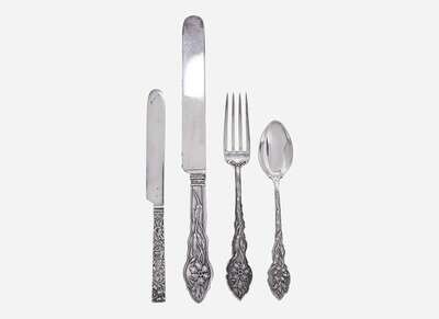 Including a luncheon service in a floral pattern, comprising six luncheon knives, six luncheon forks, and six teaspoons, all marked “Sterling 925 Fine"; and eight dessert or fruit knives in a floral pattern, S. Kirk & Son, Baltimore, MD, marked.