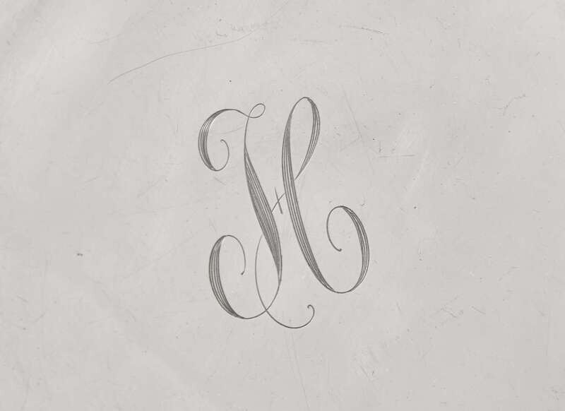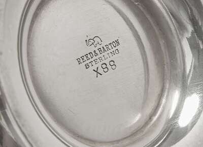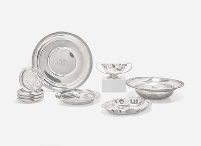 Comprising a round plate, by Webster Co., North Attleboro, MA, engraved with monogram, “H,” marked; a bowl with floral repoussé rim, by Reed & Barton, Taunton, MA, marked; a butter dish with drain, by Mueck-Cary Co., Inc., New York, NY, marked; a scalloped butter dish, S. Kirk & Son, Baltimore, MD, marked; a two-handled dish, by Reed & Barton, Taunton, MA, engraved with monogram, “R,” marked; together with a set of four silver-mounted glass coasters, unmarked.
