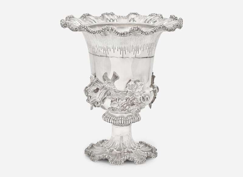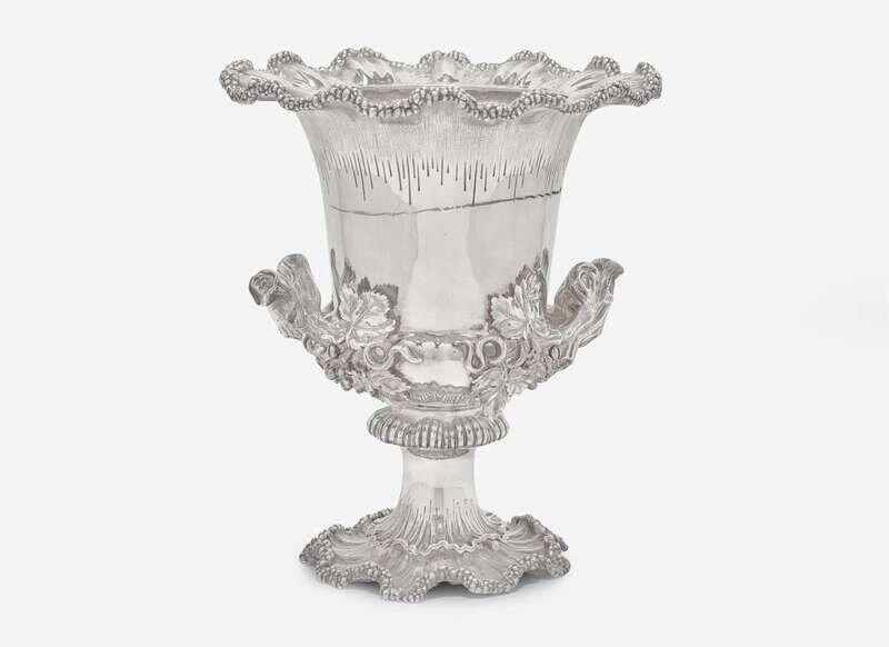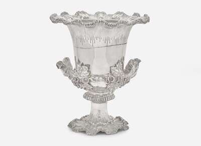 Of urn form, with scalloped wave rim and footed base, the handles in the form of grape branches, with removable metal liner, marked to base (partially obscured).