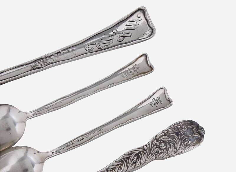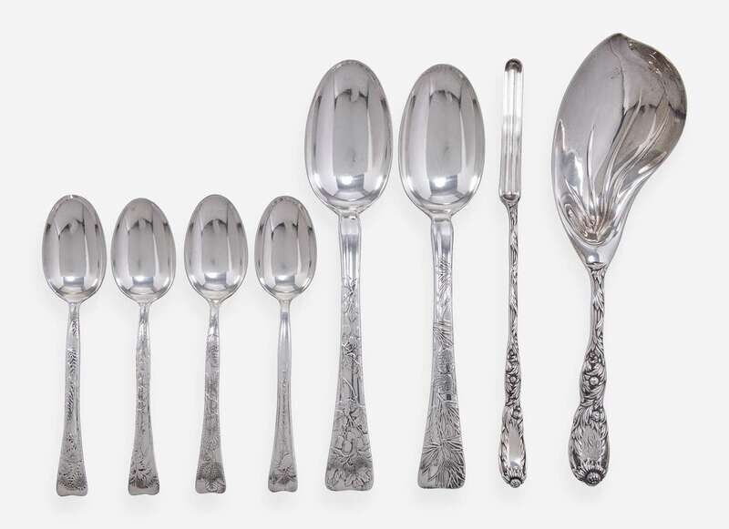 Comprising a fruit knife, a small seafood knife, nineteen teaspoons, and two large tablespoons in the "Lap Over Edge" pattern, circa 1880, bearing “M” mark for Edward C. Moore (1873-1891), the two tablespoons engraved with monogram, “MAMC,” and tree teaspoons engraved with monogram, “ML”; an oyster server and marrow scoop in the “Indian Chrysanthemum” pattern, circa 1880, bearing “M” mark for Edward C. Moore (1873-1891); an orange spoon and pickle knife in the “Holly” pattern, bearing “M” mark for Edward C. Moore (1873-1891), the spoon engraved with monogram, “AGPO”; eight oyster forks in the “Shell” pattern, bearing “M” mark for Edward C. Moore (1873-1891); three fruit or dessert knives in the “Medallion” pattern, patented 1864, engraved with monogram, “EOC,” marked; a unique individual butter knife with “poppy” design, marked; a gilt-washed in the “Olympian” pattern, circa 1880, bearing “M” mark for Edward C. Moore (1873-1891), with monogram to underside; a fruit knife in the “Custom Engraved” pattern, engraved, “Connor Lawrence,” marked; a mixed metal hammered fruit knife, bearing monogram, to underside, marked; an hors d'oeuvre fork with floral motifs, with monogram to handle end, marked; a crumber in the “King” pattern, circa 1880s, bearing “M” mark for Edward C. Moore (1873-1891); and two rare mixed metal (mokume) ice cream spoons of unique form, marked “243” and “242,” respectively, the larger one with gilt-washed bowl and evidence of faint monogram.