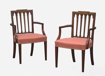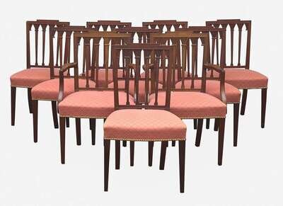 Comprising two armchairs and eight side chairs, with upholstered seats.