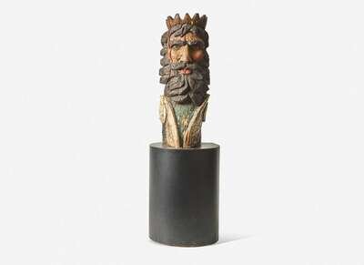 H: 43 ¾ in. W: 13 in. D: 17 in. (figurehead only), H: 32 ½ in. Dia: 24 in. (display stand)