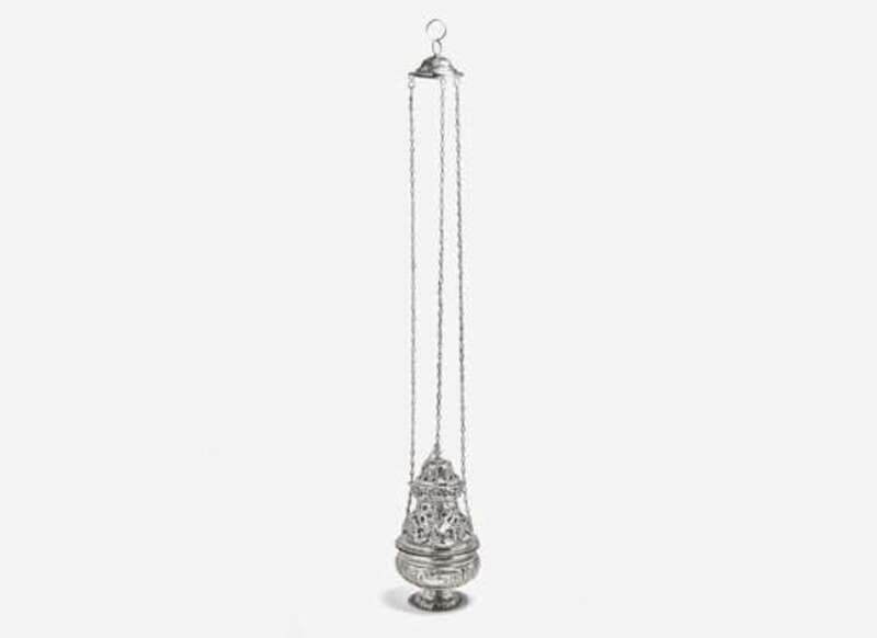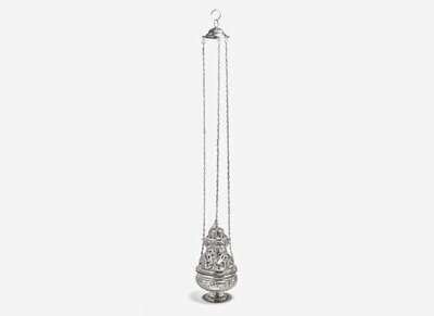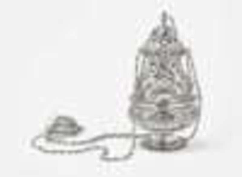 Having a pierced cover, with loop and chain for hanging, allover decorated with rococo repoussé motifs including c-scrolls, shells, and foliate motifs, apparently unmarked.