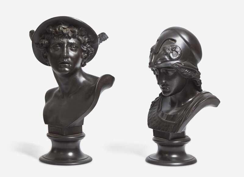 The bust of Mercury with impressed plaque to front, "MERCURY," mounted to socle, the bust and socle both marked, "Wedgwood" and "Made in England"; the bust of Minerva impressed to back, "MINERVA," the bust mounted to socle, the bust and socle both marked, "Wedgwood."