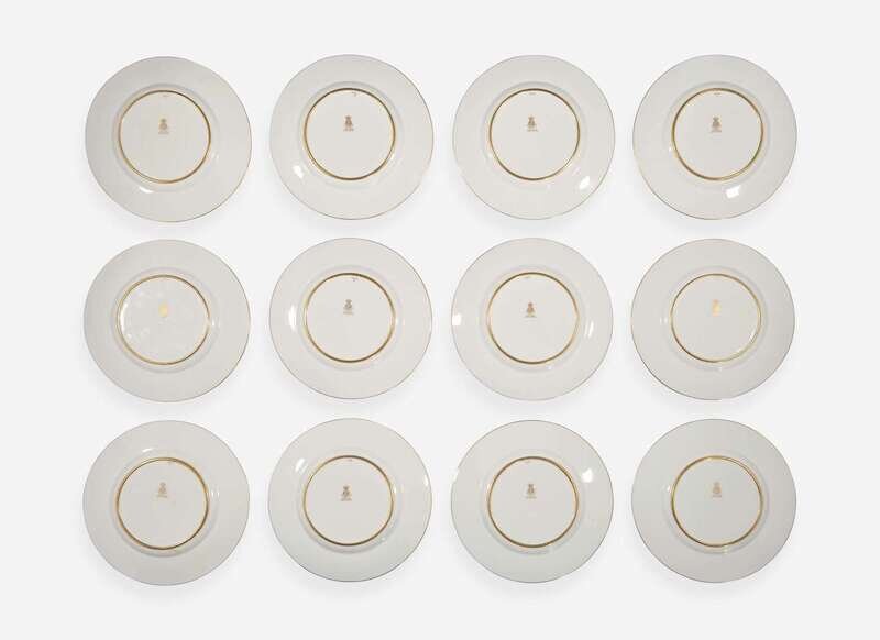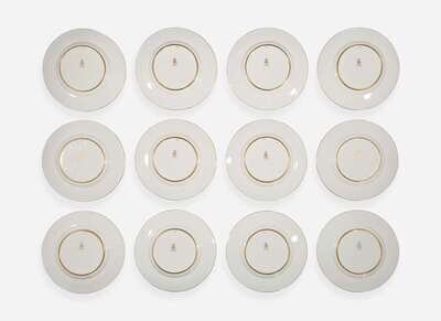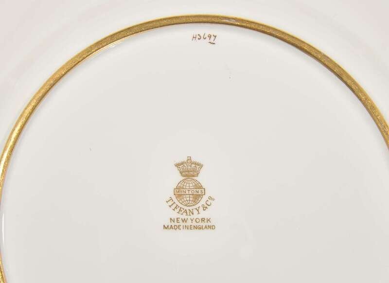 A set of twelve pate-sur-pate gilt and enameled porcelain luncheon plates, Minton, England, retailed by Tiffany & Co., New York, NY, date marks for 1928-1929