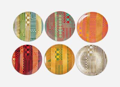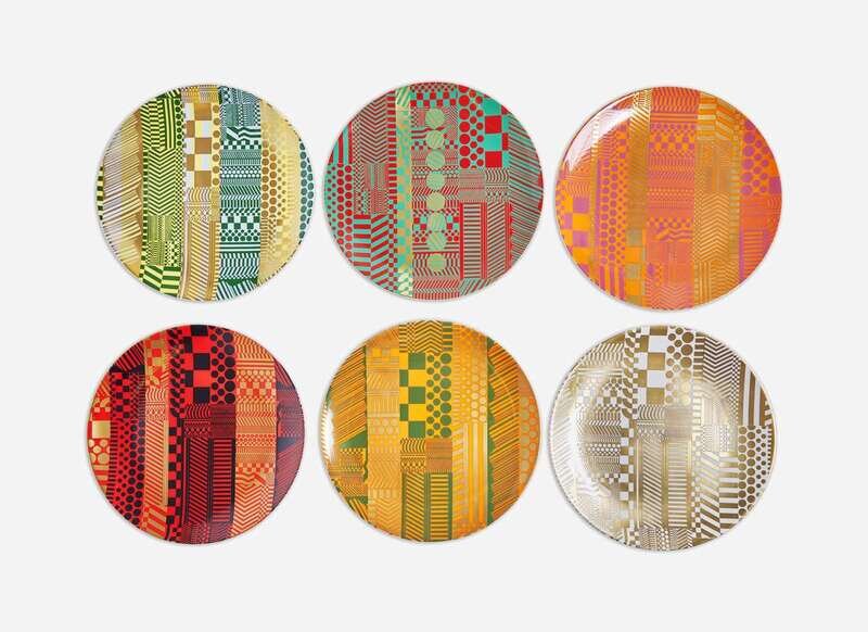 A set of six Wedgwood bone china plates in "Variations on a Geometric Theme," designed by Eduardo Paolozzi (1924-2005), Stoke-on-Trent, England, late 20th century