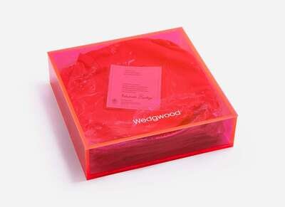 Dia: 10 ¾ in. (plate), H: 3 ¼ in. W: 11 ¼ in. D: 11 ½ in. (lucite box)