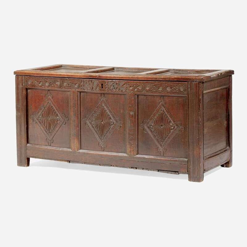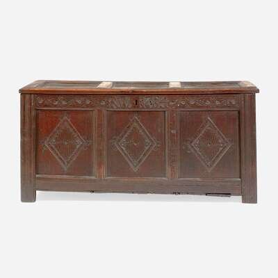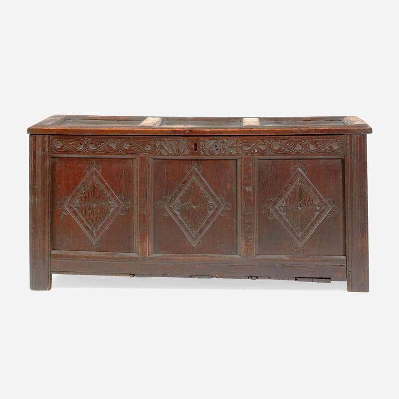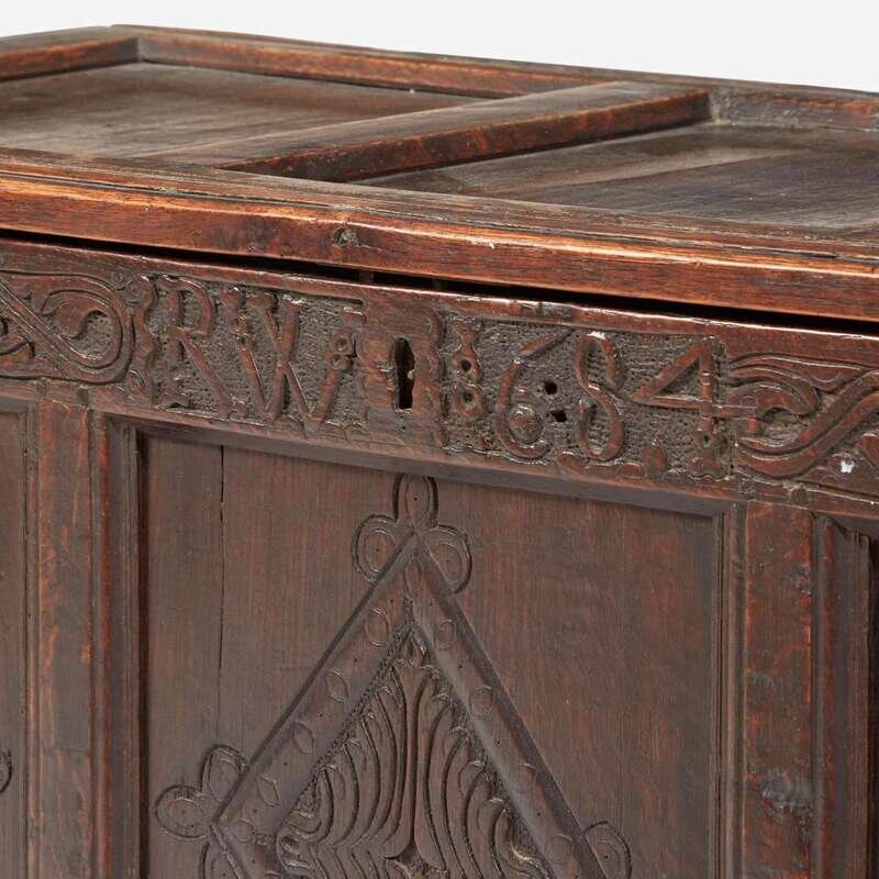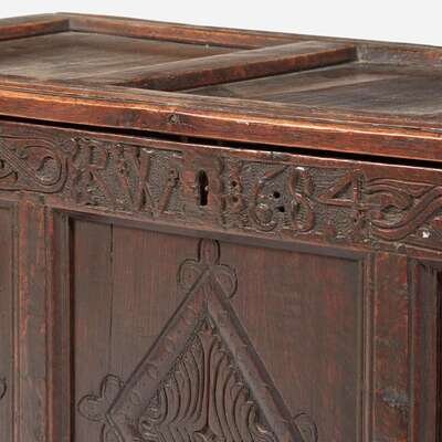 With paneled lid and sides, the front carved with diamond motifs, inscribed and dated, "RW 1684."