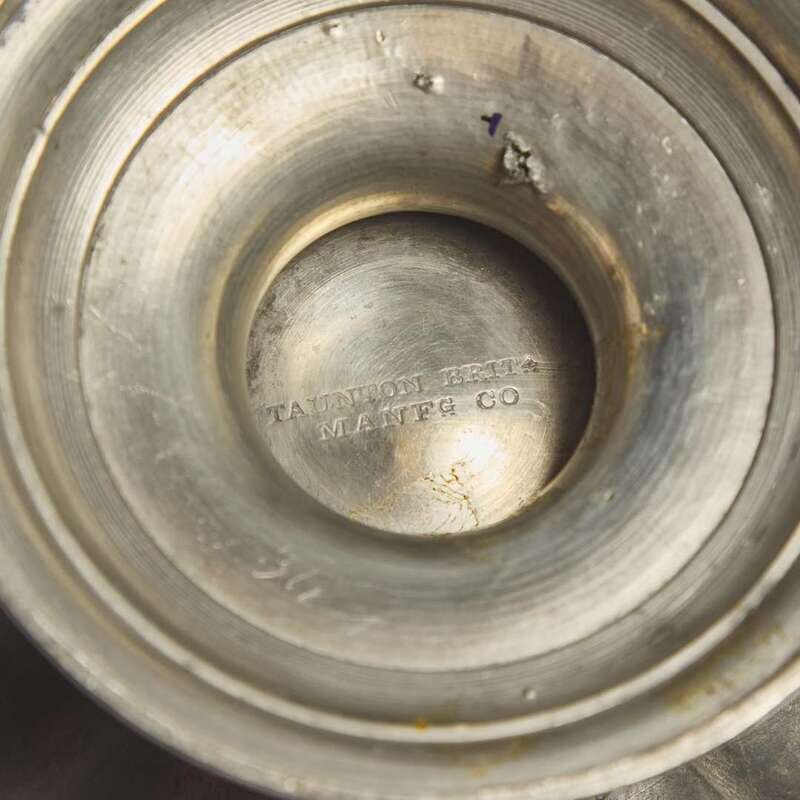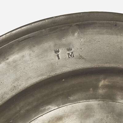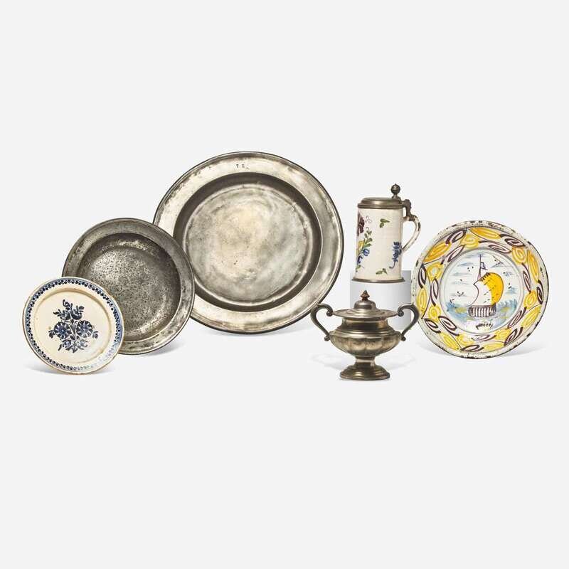 Comprising a pewter-mounted polychrome Delft tankard, lid engraved to "J.F.L.," and faintly dated "1832"; a small Delft plate with blue floral motifs, possibly 16th/17th century; a plate with ship in manganese, yellow, and blue hues, Friesland, 17th century; a large pewter charger, by Allen Bright (active 1742-1763), Bristol, with London touch marks, initialed to rim, "I M," Marked; a pewter basin, by Samuel Ellis, London, circa 1740, marked; and a pewter covered sugar bowl, by Taunton Britannia Mfg. Co., Taunton, Massachusetts, circa 1830-1835.