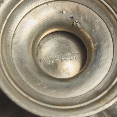 H: 9 1/4 in. Dia: 5 in. (tankard, diameter at base), Dia: 12 in. (plate with ship), Dia: 8 1/2 in. (small plate), Dia: 18 in. (large pewter charger)