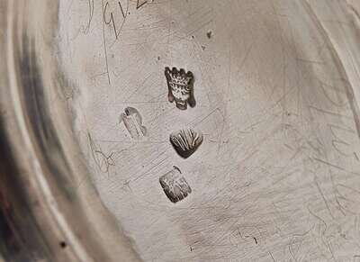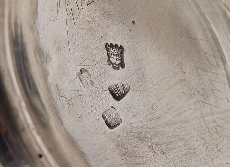 Of ovoid form, with rococo repoussé decoration including scrolls and foliate motifs, pine cone finial to lid, the body bearing armorial crest in the form of a unicorn head to one side, the other bearing engraved “E” surmounted by crown, marked to underside.