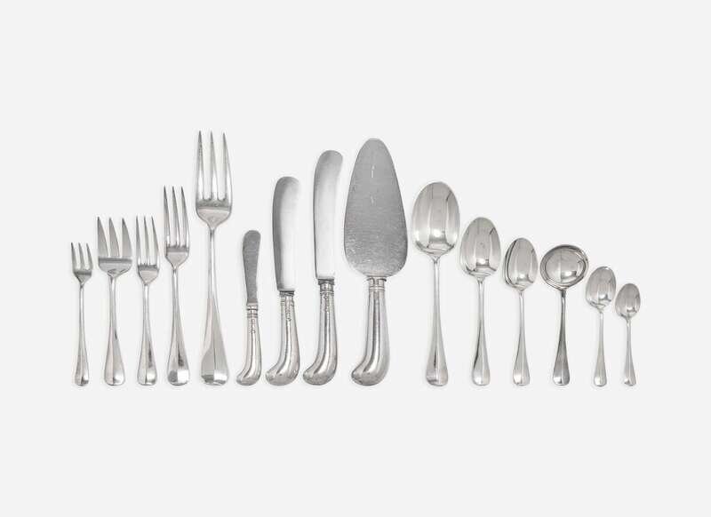 Comprising pieces produced by Cooper Brothers & Sons and Robert Ensko, most bearing monograms to back of handle, “R/ FG," marked, the pieces by Cooper Brothers & Sons as follows: twelve dinner knives, twelve luncheon knives, thirteen butter spread knives, a cake knife, twelve large tablespoons, twelve smaller tablespoons, ten teaspoons, twelve cream soup spoons, twelve coffee spoons, a serving fork, twelve oyster forks, twelve dinner forks, ten salad forks, and eleven luncheon forks, the pieces by Robert Ensko as follows: two serving spoons and twelve demitasse spoons; sold together with miscellaneous serving pieces including a sterling handled serving knife by J.A. Henckels, Germany, blade marked; a sterling silver serving fork and spoon engraved with monogram, “R,” by Georg Jensen Inc. U.S.A., one marked; a sterling silver serving tongs by Gorham Mfg. Co., engraved with monogram, “GGR,” marked; a sterling silver serving spoon, marked “Sterling”; a sterling silver seafood fork; a cake knife with sterling silver handle, by Wallace, blade marked; a cheese knife, possibly with silver handle, but unmarked; a butter knife with “Little Bo Peep” handle, handle possibly silver, but unmarked; a plastic salad spoon and fork, possibly with silver handles, but unmarked; a silverplated serving spoon and fork, marked “EPNS” and “England”; and a silverplated tongs, marked “Made in England.” (170 items total).