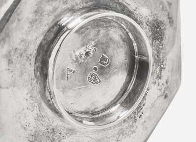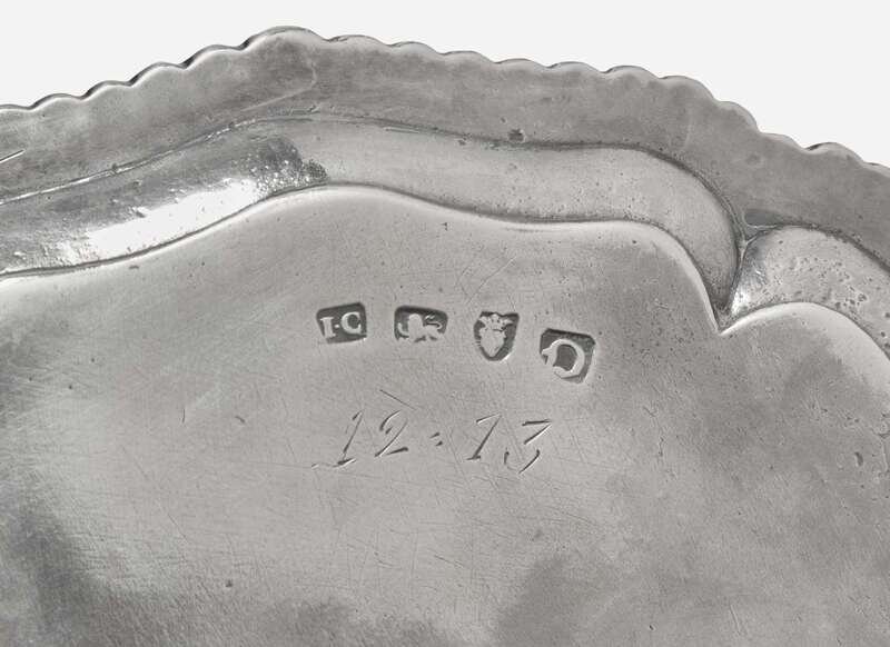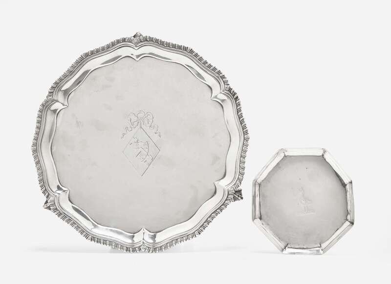 Comprising a salver by John Carter II, London, 1769, with scalloped and gadrooned edge, bearing engraved armorial crest, on ball-and-claw feet, marked; and a small octagonal footed tray, engraved with crest in the form of a crane, Dublin, 1730, engraved to underside with monogram, “AS," marked.