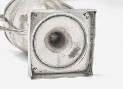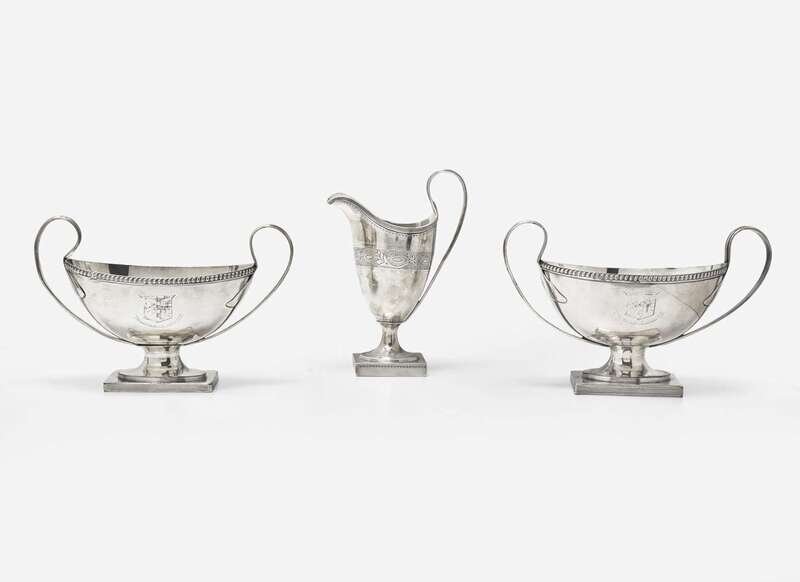 The creamer of Classical form on footed base, with bright-cut decoration including armorial crest in the form of a ship and banner inscribed, “Spero Meliora,” marked to underside; the pair of sauce tureens of Classical form, each bearing armorial crest and banner inscribed, “Consilio Et Animis,” apparently unmarked.