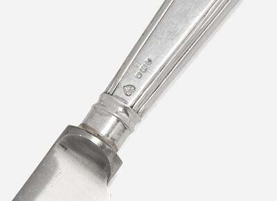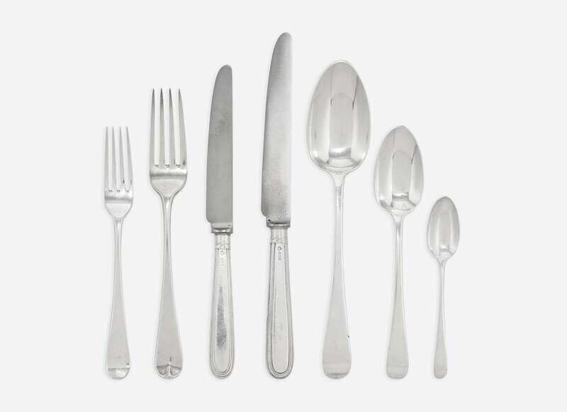Comprising a group of George III sterling silver flatware by William Eley I, William Fearn, and William Chawner II, London, 1808, including twelve large tablespoons, twelve tablespoons, twelve teaspoons, twelve dinner forks, and twelve luncheon forks, all marked; together with twelve dinner knives and eleven luncheon knives, by maker “AHN," within inverted heart, Sheffield, 1970, marked.