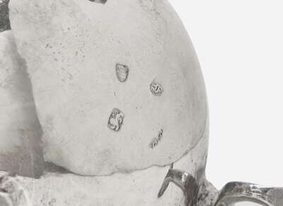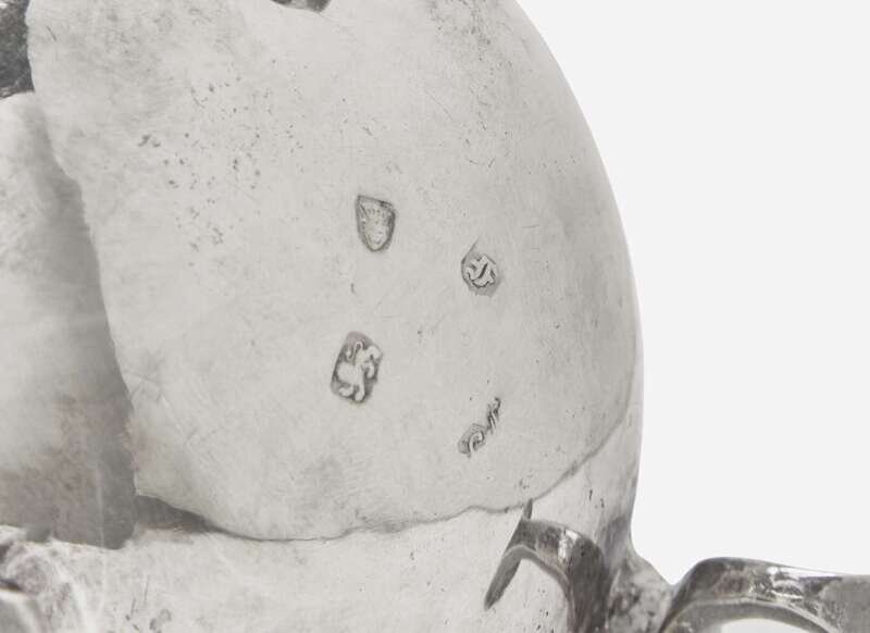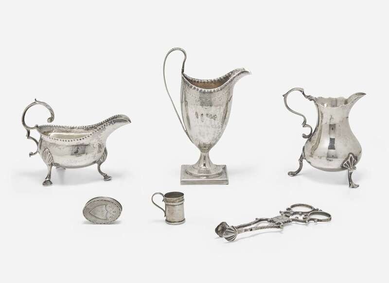 Comprising a George III pear-form creamer, with scrolled handle and shell-form feet, maker's mark rubbed, London, 1761; a George III creamer with bright-cut decoration including navette-form cartouche, by George Gray, London, 1788, marked; a George III creamer with punched rim, scrolled handle, and hoof-form feet, by Thomas Shepherd, London, 1782, engraved with monogram, “SB,” marked; an Irish George III sugar tongs, Dublin, no maker or date mark, engraved with monogram, “HF”; a George III navette-form pill box, Joseph Taylor, Birmingham, 1795, engraved with bright-cut decoration and cartouche with monogram, “MC to AB,” marked; and a miniature tankard, by J. Wilmot, Birmingham, 1900, marked.