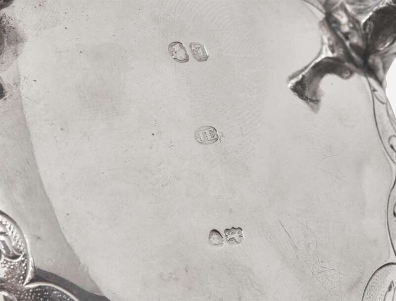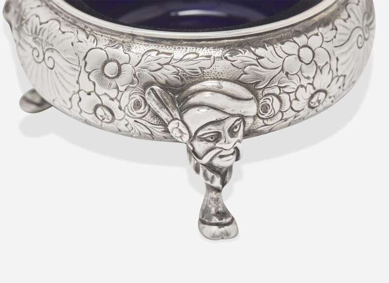 The bodies with repoussé floral and rocaille motifs and a reserve with engraved armorial device in the form of a heart and hand with sword, each on three feet with terminals depicting turbaned men, on hoof-form feet, with cobalt blue glass liners, marked to underside.