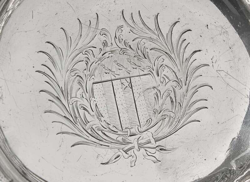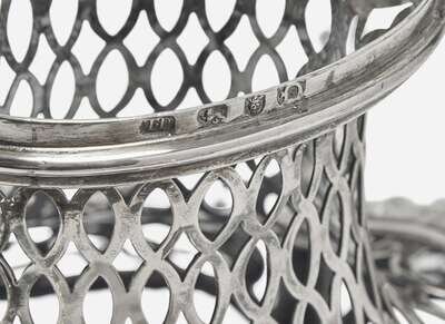 Of rococo form, with pierced and gadrooned base having four scrolled feet, with detachable bowl and four detachable scrolled arms with cut glass bowls, the bowl with engraved armorial crest to well, each item marked;