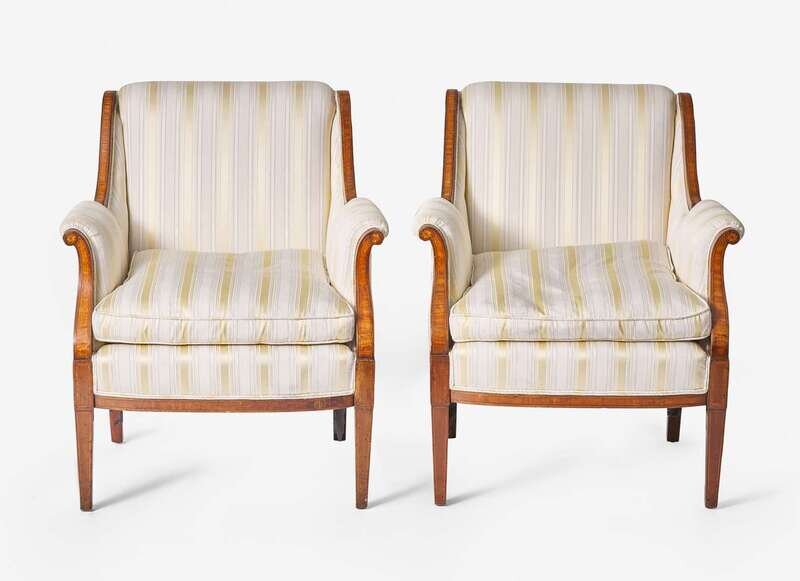 With scrolled and padded arms, on tapered legs, with striped silk upholstery.