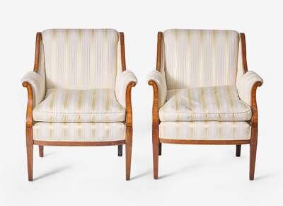 A pair of George III style inlaid mahogany and satinwood armchairs, likely late 19th century