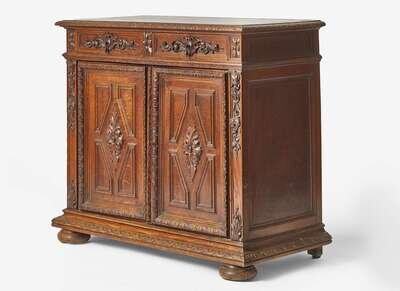 With molded rectangular top, over two drawers with carved foliate motifs, above two paneled doors flanked by floral garlands, revealing one adjustable shelf, on molded base with bun feet.