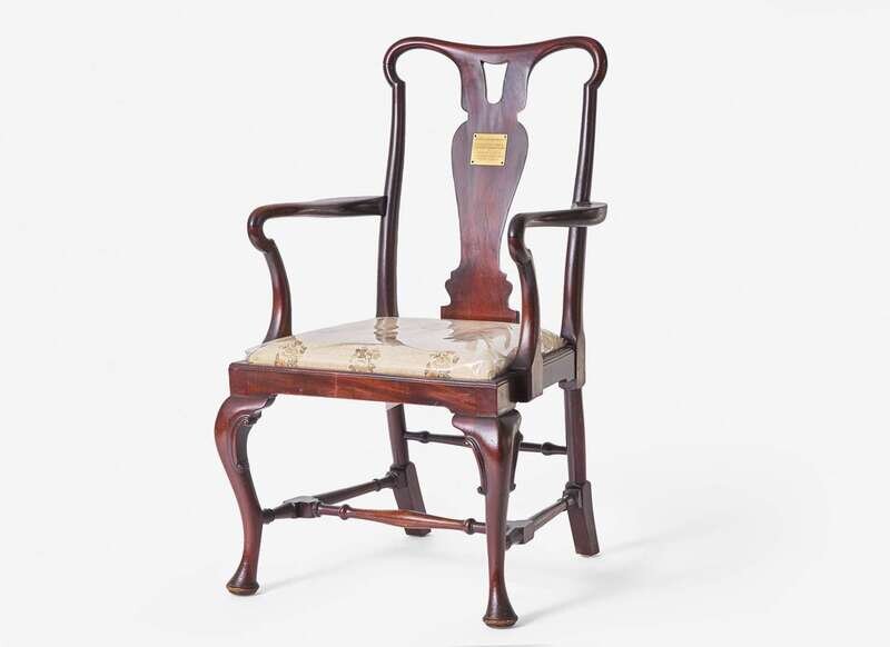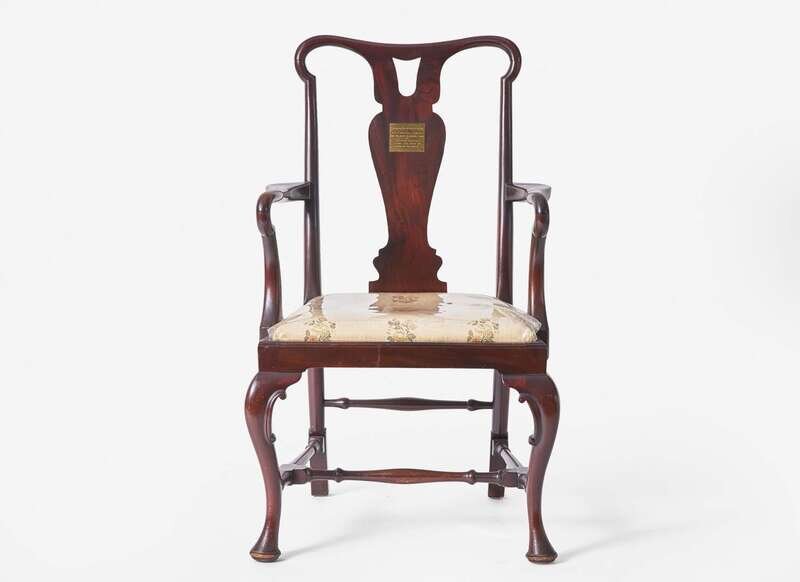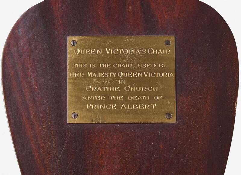 With yoke-back crestrail and solid splat, mounted with brass plaque engraved, "Queen Victoria's Chair/ This is the Chair Used by Her Majesty Queen Victoria in Crathie Church After the Death of Prince Albert," shepherd's crook arms, cabriole legs with carved c-scrolls, terminating in pad feet, the legs connected by turned stretchers, back of seat rail marked, "III," with slip seat upholstered in later floral silk.